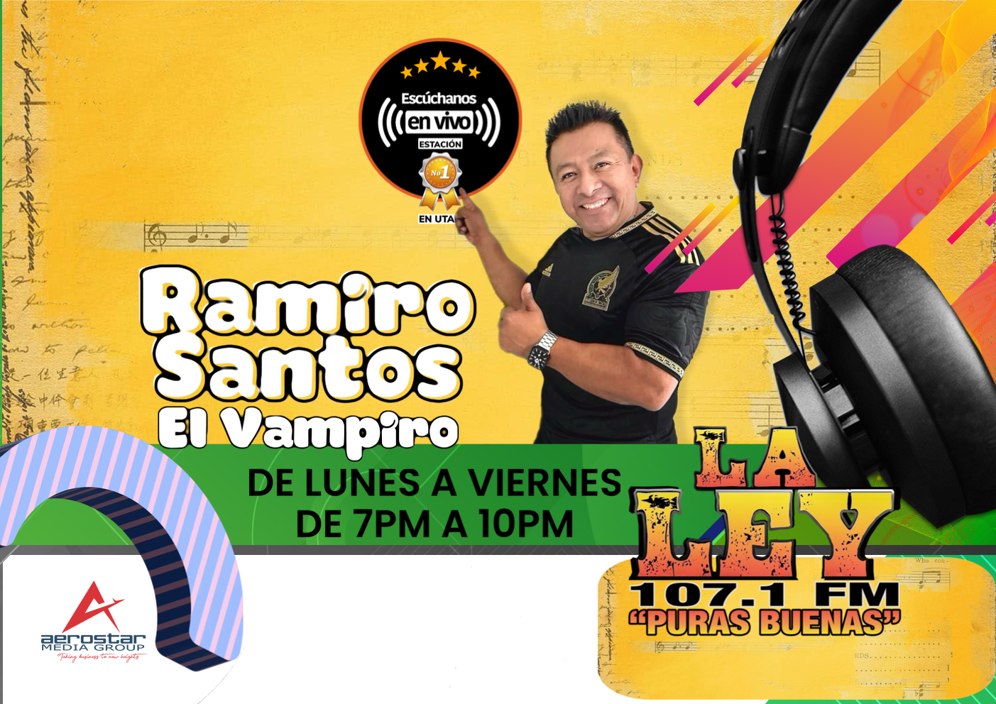 En el caso del show radial sabatino, El Vampiro lleva la rienda de los controles, pero sigue dejando que los protagonistas sean los invitados y sus colaboradores. Ahora Ramiro Santos forma parte de las filas de Aerostar Media con el programa de entretenimiento con entrevistas 100% local y con el mismo propósito de seguir apoyando al talento musical, de social media y de emprendimiento.