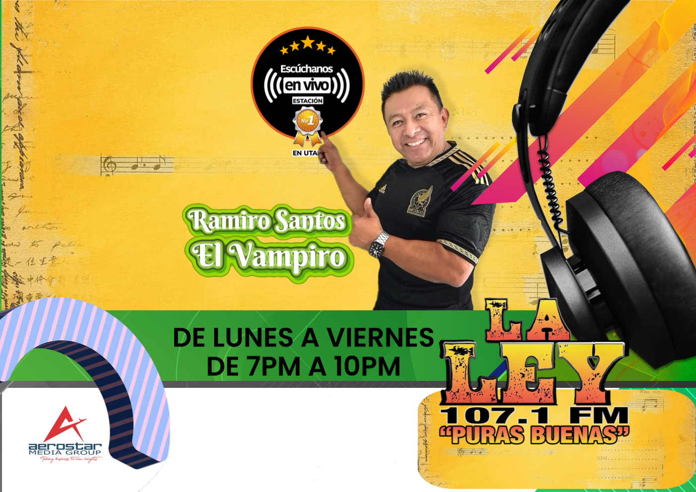 “El Vampiro” llega a La Ley 107.1 FM todas las noches de lunes a viernes con entretenimiento y reflexiones, sin dejar de lado los horóscopos, conexión de parejas, historias reales y sub-reales, actualización deportiva, resumen de noticias locales y del mundo, cartelera y calendario de eventos comunitarios y los viernes de pachanga con puras buenas en la música para iniciar un buen fin de semana. Te invitamos a sintonizar La Ley 107.1 fm porque también tendrás la oportunidad de llamar a cabina en vivo y en directo para ofrecer tus objetos o cosas que ya no utilizas por medio de los “Clasificados de la Noche” en punto de las 7:00 pm (lunes a viernes).